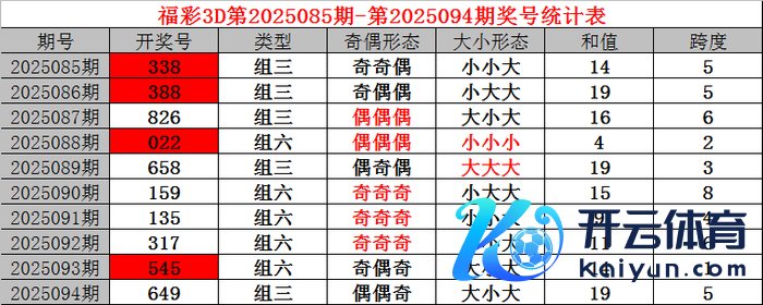 上期归来:福利彩票3D第2025094期开奖后果649。奖号:偶偶奇、大小大,和值19,跨度5。