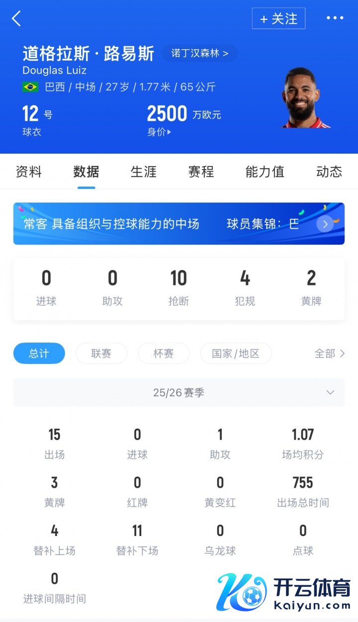 旧年夏天路易斯租出加盟诺丁汉丛林,球员当今德回身价为2500万欧,巅峰身价7000万欧。