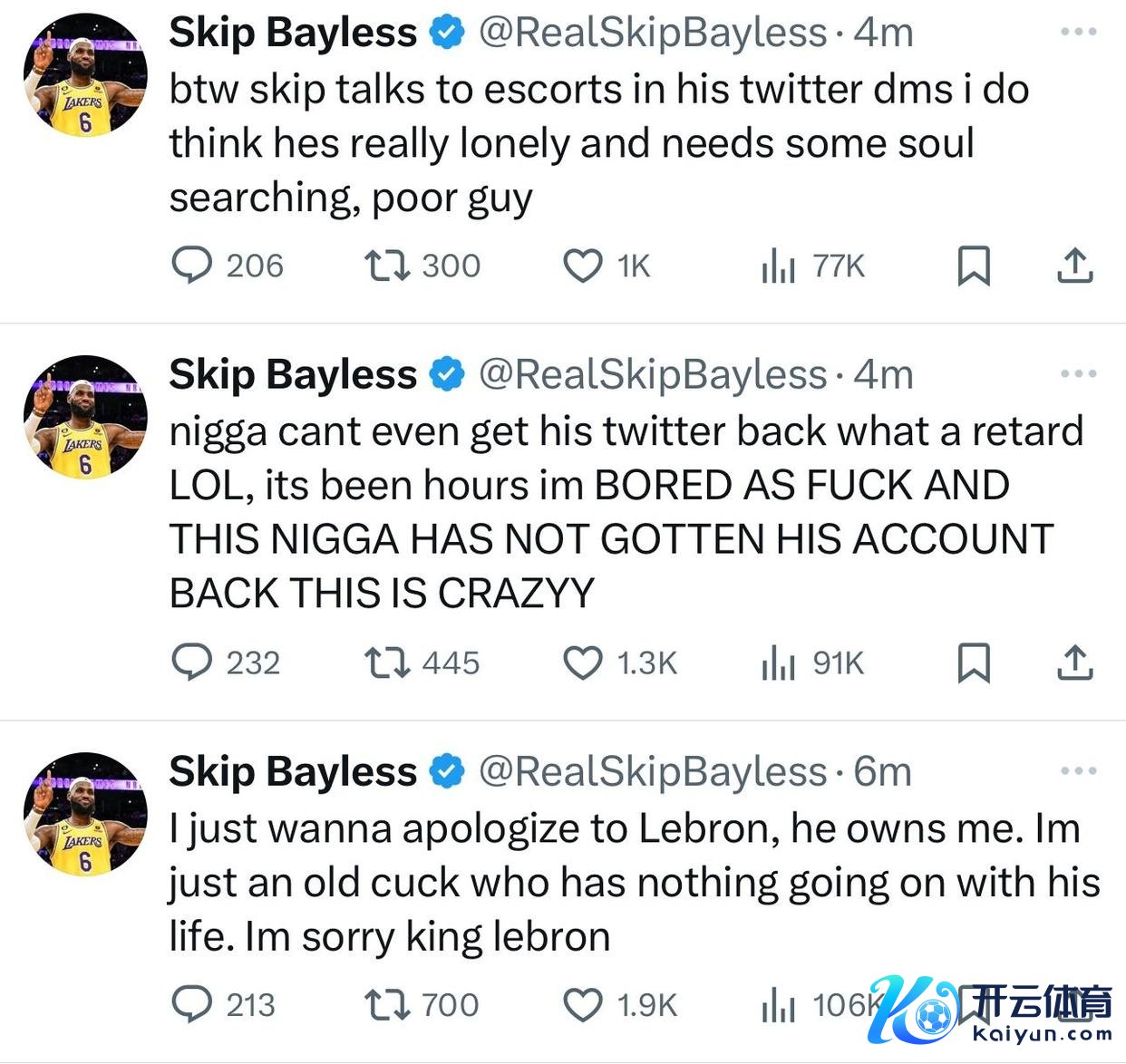 Skip的账号中写说念:“我念念对詹姆斯说念歉,他打败我了,我不外是一个在生存中无所事事的老登,抱歉,国王勒布朗。”