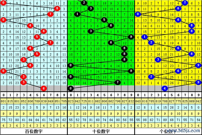 (2)在号码频次方面,开出个数最少的三个号码为:1、5、2,一般来说这三个号码不会同期出现,本期杀一码5;开出个数最多的四个号码辩认为:6、0、8、3,本期看好这四个号码中包含1-2个开奖号码,胆码参考3。0。