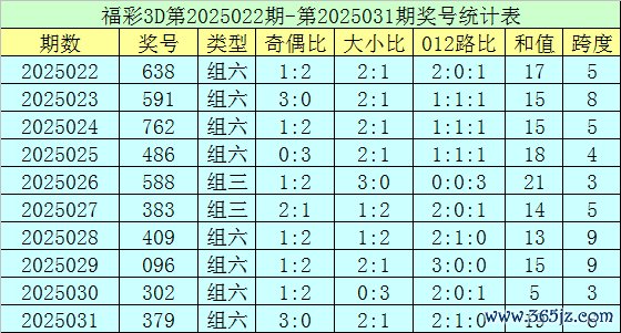 上期总结:福彩3D第2025031期开奖号码为379体育集锦,组选类型为组六,奇偶比为3:0,大小比为2:1。
