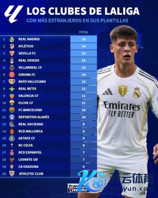 9月16日讯 频年来,皇马引进了多名外籍球员,这让球队中外籍球员比例逼迫上涨。证实德国转会市集的统计,皇马阵中当今有18名外籍球员,占比高达72%(18/25),是西甲中外籍球员最多的俱乐部。