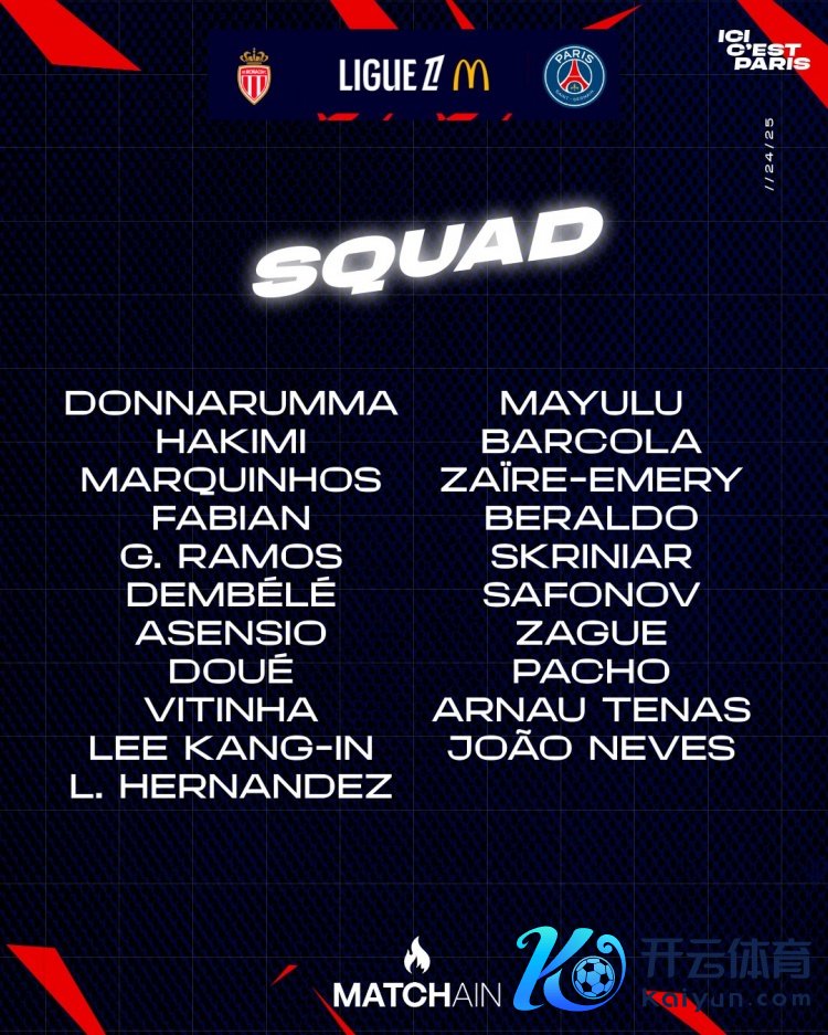 12月18日讯 北京时刻未来凌晨4点,巴黎将在法甲第16轮比赛中客场对阵摩纳哥,巴黎公布了此役的球员名单,什克里尼亚尔转头,努诺-门德斯、金彭贝、穆阿尼缺席。