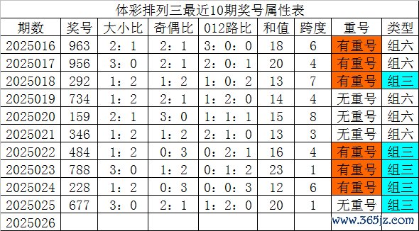 体彩摆设三最近10期分歧开出奖号:963、956、292、734、159、346、484、788、228、677,各奖号属性详见下表: