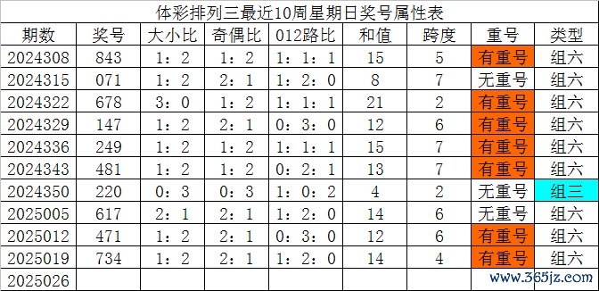 体彩摆设三最近10周日曜日奖号分歧为:843、071、678、147、249、481、220、617、471、734,各奖号属性详见下表: