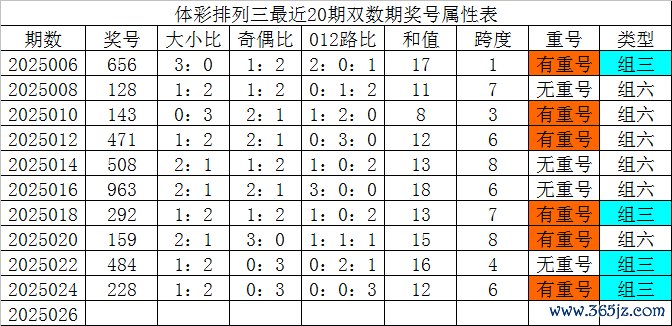 体彩摆设三最近20期双数期奖号分歧为:656、128、143、471、508、963、292、159、484、228,各期奖号提神属性下表: