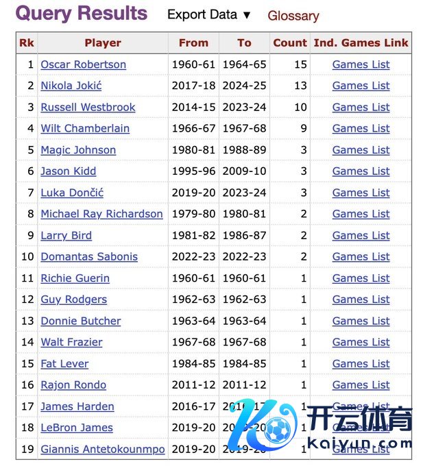 据统计,这是约基奇生存第14场比赛至少15分15板15助攻,历史第2多,距离历史记录保抓者大O仅差1次。